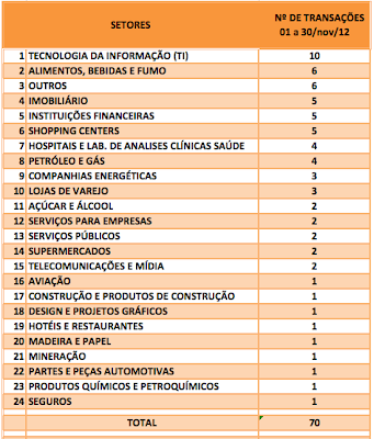 Em novembro/12, o segmento TECNOLOGIA DA INFORMAÇÃO (TI) continua liderando com a realização de 10 transações representando 14% do total, seguido por ALIMENTOS, BEBIDAS E FUMO; OUTROS; IMOBILIÁRIO; INSTITUIÇÕES FINANCEIRAS e SHOPPING CENTERS.