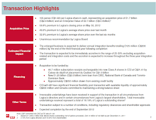 O CGI Group, provedora canadense de serviços de tecnologia da informação (TI), anunciou hoje um acordo para a aquisição da Logica, companhia britânica do mesmo segmento. Além de assumir uma dívida de 322 milhões de libras (US$ 501 milhões), a CGI pagará 105 pence (US$ 1,63) por ação ordinária da Logica, avaliando a transação em um total de 1,7 bilhão de libras (US$ 2,6 bilhões). A expectativa é que a operação seja concluída no fim de setembro.