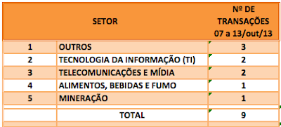 Na semana passada de 07 a 13/out/13, foram anunciadas com destaque pela imprensa 9 operações de Fusões e Aquisições, envolvendo direta ou indiretamente empresas brasileiras de 5 setores.