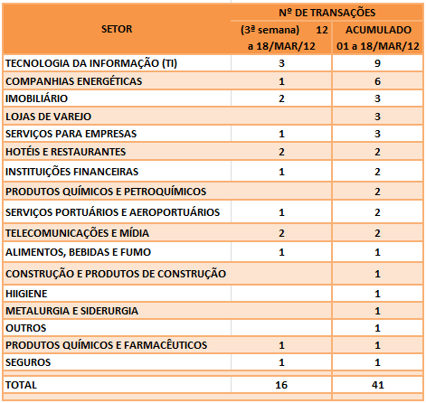 FUSÕES E AQUISIÇÕES - DESTAQUES DA SEMANA DE 12 A 18/MAR/12