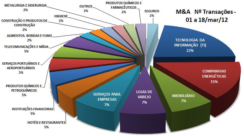 Operações de Fusões e Aquisições divulgadas com destaque pela imprensa brasileira no decorrer do mês de janeiro de 2012. Foram apuradas 56 operações no mês de janeiro/12, sendo que 5 setores responderam por 50% do total. O segmento Tecnologia...