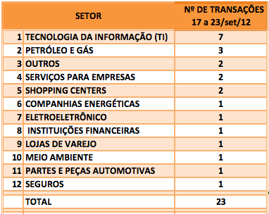 Na semana de 17 a 23/set/12 foram divulgadas com destaque pela imprensa 23 operações de Fusões e Aquisições.