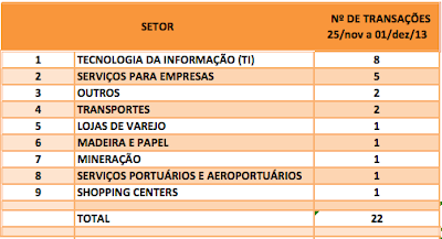 No decorrer da semana de 25/nov a 01/dez/13, foram anunciadas com destaque pela imprensa 22 operações de Fusões e Aquisições, envolvendo direta ou indiretamente empresas brasileiras de 9 setores.