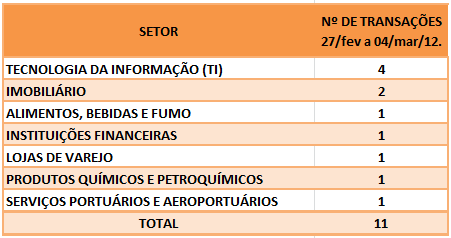 Na semana de 27/fev a 04/mar/12 foram divulgadas com destaque pela imprensa 11 operações de Fusões e Aquisições.