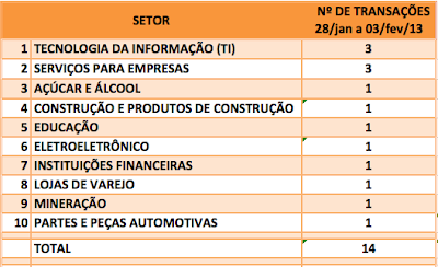 Durante a semana de 28/jan a 03/fev/13 , foram anunciadas com destaque pela imprensa 14 operações de Fusões e Aquisições, envolvendo direta ou indiretamente empresas brasileiras de 10 setores.