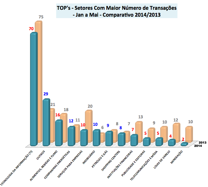 Nos primeiros cinco meses deste ano, apurou-se uma queda de 20,5% no total das transações do mesmo período de 2013. Os setores de TECNOLOGIA DA INFORMAÇÃO (TI) e OUTROS foram os mais ativos no mês de abril.