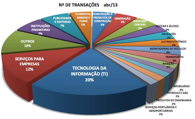 Em abr/13, o segmento TECNOLOGIA DA INFORMAÇÃO (TI) continua liderando com a realização de 12 transações representando 20% do total.