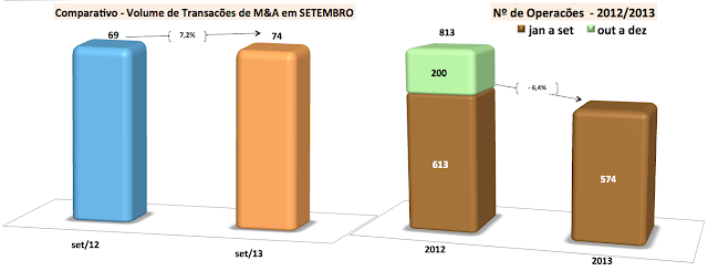 Apuradas 74 transações no mês de SETEMBRO/13, em 22 setores da economia brasileira, registrando um crescimento de 7,2% em relação ao mês anterior ( 69 operações).