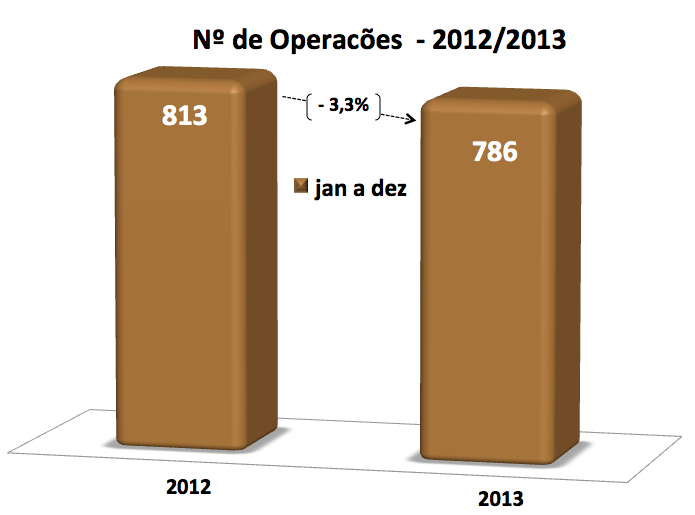 No acumulado do número de negócios realizados nos últimos doze meses - dezembro/13, com 786 operações, comparativamente ao mesmo período de mês anterior, indica um crescimento tímido, mas constante, ao longo do último semestre.