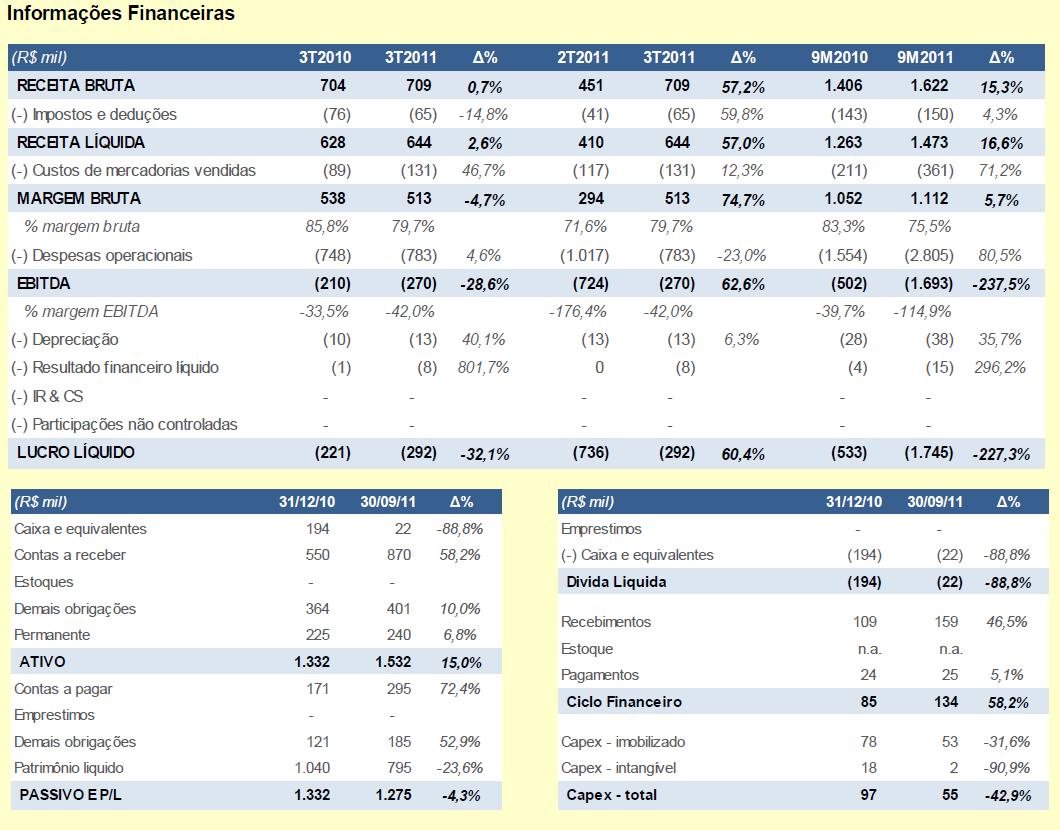 No site da Ideiasnet a empresa de Venture Capital de tecnologia, anuncia resultado do terceiro trimestre de 2011 (3T11), e destaca o desempenho da Hands.