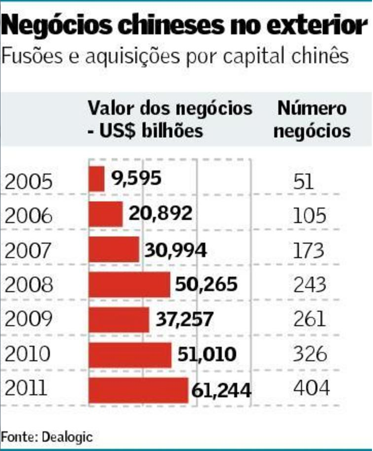 O investimento chinês em fusões e aquisições (M&A, na sigla em inglês] no exterior cresceu solidamente nos últimos três anos, atingindo US$ 61,2 bilhões em 2011, segundo dados da consultoria Dealogic (veja gráfico). Isso representa a maior parte dos US$ 72,4 bilhões que Pequim estima ter investido no exterior no ano passado. Esses dois valores são recordes.