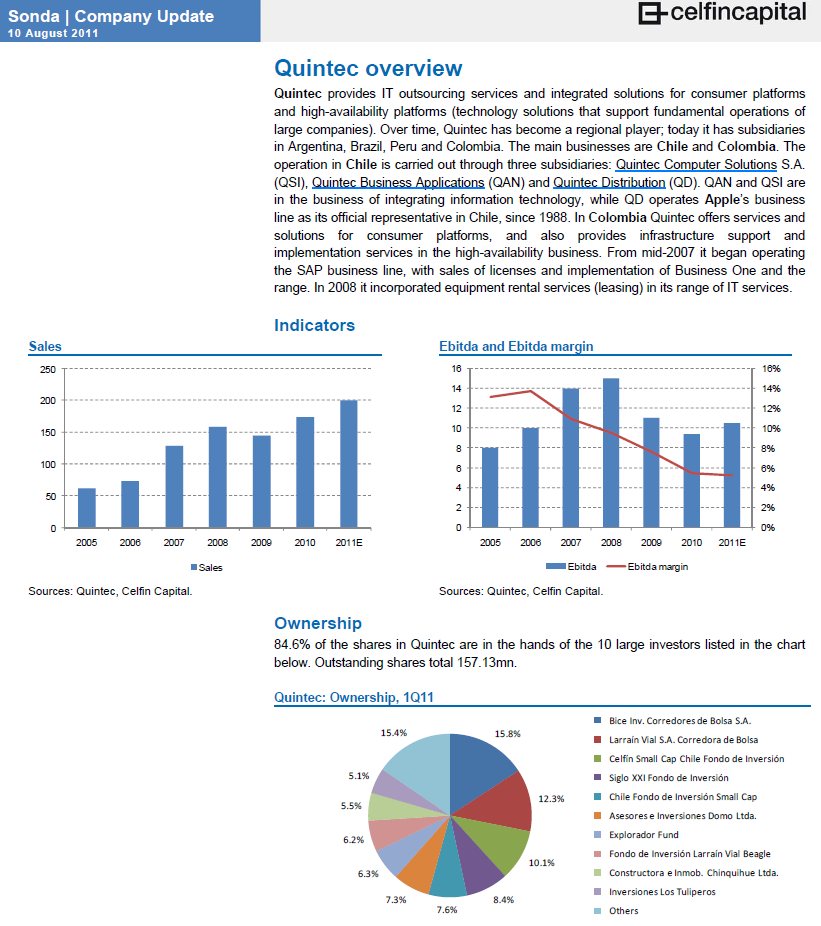 Em comunicado, a Sonda afirmou que a aquisição vai permitir que a companhia amplie sua base de clientes no Chile, Brasil, Colômbia, Argentina e Peru. Em julho de 2009, a empresa já havia tentado adquirir a Quintec. Na época, o acordo proposto chegou ao valor de 165 pesos por ação.