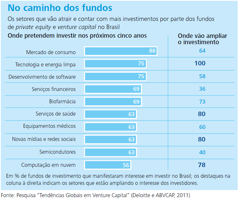 O estudo “Tendências Globais em Venture Capital”, realizado pela Deloitte em junho de 2011 com o apoio da Associação Brasileira de Private Equity e Venture Capital (ABVCAP), mapeou o investimento dos fundos no País.